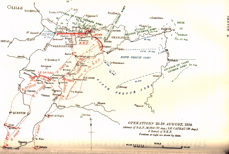 In this great movement, the outline of which has already been given, the British were to advance on the left of the Fifth Army north-east, by way of Soignies, in the general direction of Nivelles. If Kluck wheeled southward from Brussels, it was not anticipated that his right would extend much beyond Mons. If, therefore, the British were in line about this place, they would be ready, when once General Lanrezac had passed the Sambre, to wheel eastward and envelop the right of the Germans. To make this envelopment the more certain, General Sordet's cavalry corps, which had on this day fallen back across the Sambre to Fontaine l'Evêque (midway between Charleroi and Binche), was directed to take position beyond the left of the British. Still further to the west, the three French Territorial divisions, under the command of General d'Amade, were to push gradually forward.