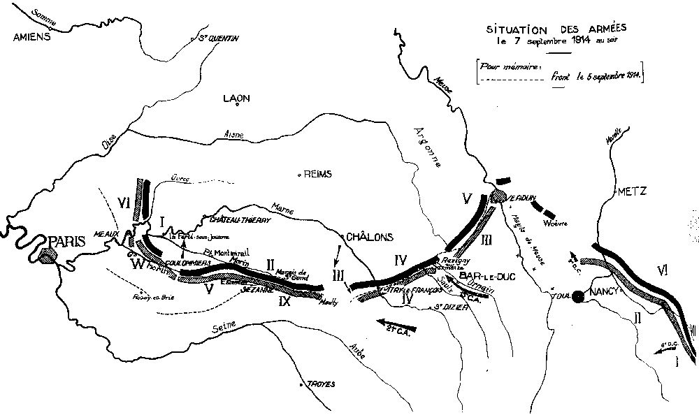 En réalité, la situation de l'aile droite allemande est autrement compromise que le général en chef ne le pense d'après les informations incomplètes qu'il a reçues (il ne sait pas encore le résultat des reconnaissances de l'aviation britannique, qui signalent de nombreuses et importantes colonnes ennemies se repliant vers le nord-est dans la région de l'Ourcq).