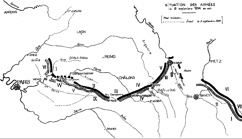 La bataille revêt le 8 septembre son maximum d'intensité. Les Allemands font de violents efforts, au centre et aux ailes, pour rompre la nasse dans laquelle ils se sentent dangereusement engagés; sauf devant l'armée britannique et la gauche de la Vème armée française, où ils continuent leur repli vers la rive nord de la Marne, ils attaquent partout. Journée d'inquiétudes, mais journée décisive, au cours de laquelle le général en chef, appréciant avec clairvoyance la position périlleuse de l'aile droite allemande, donne à sa manœuvre offensive l'orientation nouvelle qui déterminera la victoire.