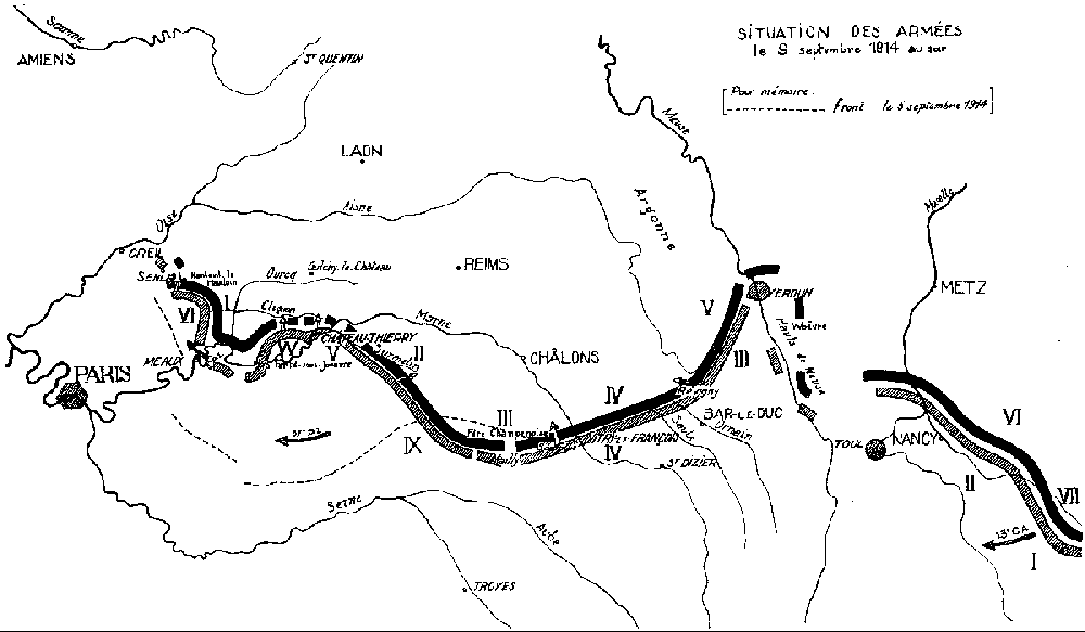 - l'autre comprenant le reste de la Ière armée allemande (IIIème et IXème corps actifs) et les 2ème et 3ème armées allemandes, reste opposé, face au sud, aux Vème et IXème armées françaises