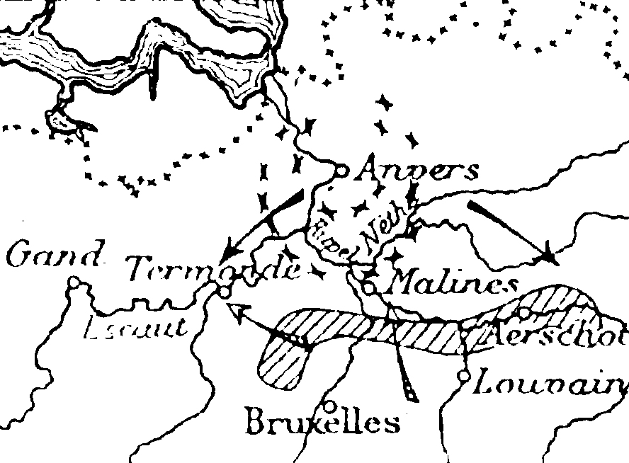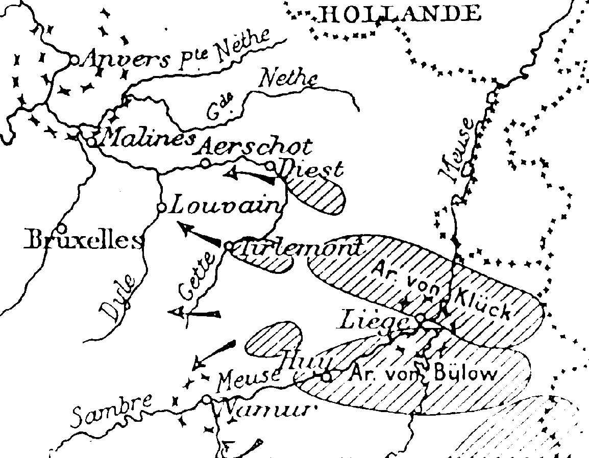 15 - 20 août, l'armée belge, menacée d'écrasement, se replie de la Gette sur le camp retranché d'Anvers, suivie de près par l'ennemie qui entre, le 19 à Louvain, le 20 à Bruxelles. |