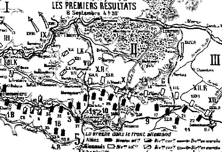 Observez la portée de ces deux mouvements qu'exécutent simultanément et sans s'être donné le mot la Ire et la IIe armées allemandes. La Ire (von Kluck) bat en retraite en pivotant autour de Nanteuil-le-Haudouin et en ramenant sa gauche sur le Clignon; la IIe bat en retraite en pivotant autour de Mondement et se retire sur Dormans. Résultat : le trou s'élargit jusqu'à devenir béant; la situation s'aggrave de minute en minute. Dans le vide ainsi formé, il ne reste plus que les débris des deux corps d'armée de cavalerie qui entretiennent tant bien que mal la liaison.