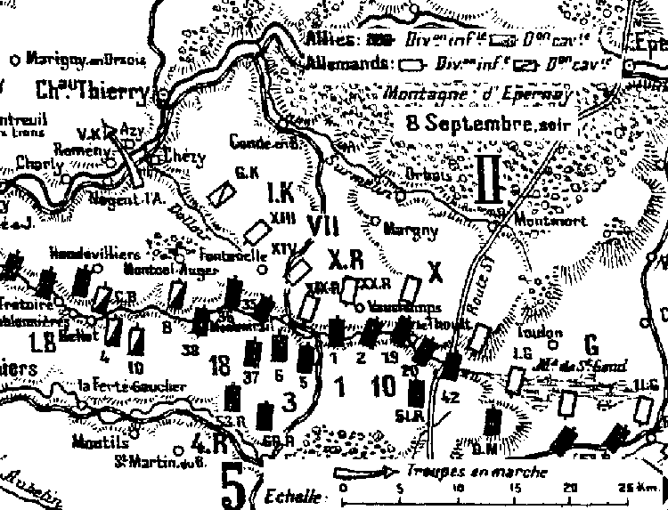 Au delà de la Marne, la route Romeny, Azy, Château-Thierry, affectée à l'armée britannique par l'ordre général n° 7 en date du 7 septembre, est réservée à la 5e armée."