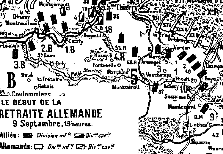 Rien n'est plus clair : c'est la retraite sur toute la ligne après une offensive à gauche dans la matinée pour renforcer le pivot ; l'artillerie laissée en arrière pour faciliter le décrochement et couvrir la retraite. On est très fier d'avoir repassé la Marne avec armes et bagages dans la journée du 9.