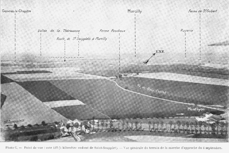 Le général de Lamaze a rejoint le général Leguay à Monthyon vers 10 heures. Du balcon d'une maison de la lisière nord du village, il jouit d'une vue étendue sur la plaine jusqu'à la Thérouanne et peut ainsi facilement suivre à la jumelle la progression de ses divisions sur presque tout le front (Voir photo C). Là, des nouvelles de l'ennemi lui parviennent de l'armée : des avions signalent que deux colonnes ennemies de divisions franchissent à 9 heures, avec leur tête, la Marne à Varreddes et à l'Isle-les-Meldeuses, marchant du sud au nord.