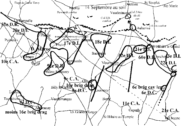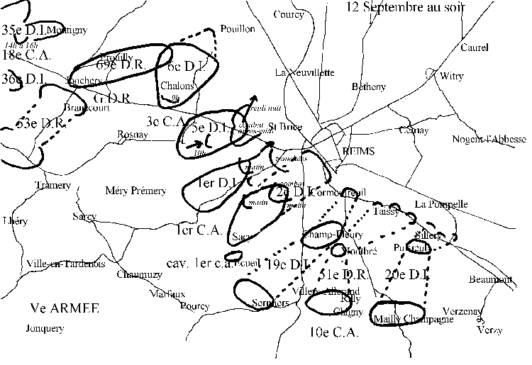 La 2e armée gagnera, le 12, la coupure de la Vesle, de part et d'autre de Reims. La 1re armée se repliera encore le 11 derrière l'Aisne et s'étendra, sous la protection de la coupure de l'Aisne, jusqu'à hauteur de l'aile droite de la 2e armée. Les passages de la Vesle à Braine et Fismes seront tenus chacun par une brigade mixte de la 2e armée, à partir du 11 au matin. (une seule division du XVIIeme C.A. - comme sur le Dolloir !!!!!)