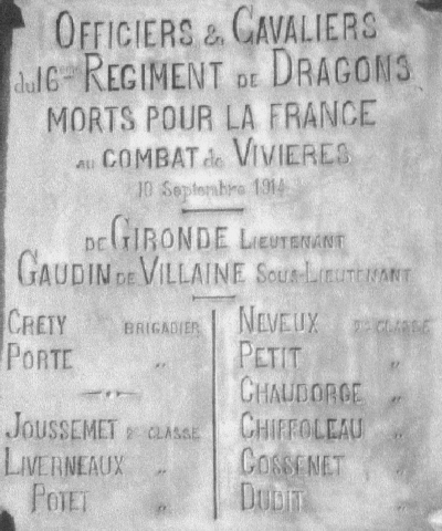 4 - Cérémonie au Monument aux Morts, puis visite du cimetière communal de Vivières, où reposent le lieutenant de Gironde et le dragon Neveux. Réception à Vivières avant un transfert au Château de Montgobert (5) pour le pique-nique. |