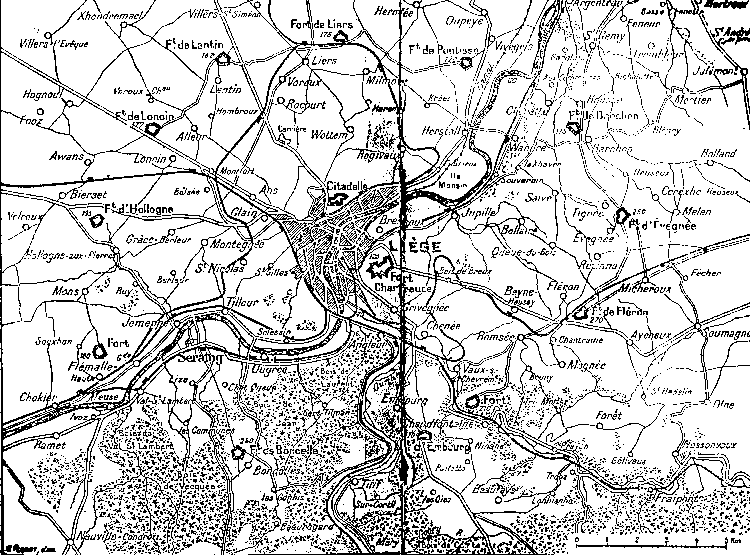 Le 13 août les forts de Pontisse et de Chaudfontaine, le 14 août les forts de Liers, de Fléron et d'Embourg tombèrent entre nos mains. La rive droite de la Meuse était par suite complètement en notre pouvoir; la chute prochaine des autres forts pouvait être sûrement envisagée. La 9e D. C. traversa la Meuse le 14 août à midi sur un pont jeté près de Hermalle par le Xe C. A. et gagna, par une marche en avant sur Waremme, la liaison avec le 2e C. C. qui avait atteint Engelmannshoven avec la 4e D. C. et Wimmertingen avec une autre division.